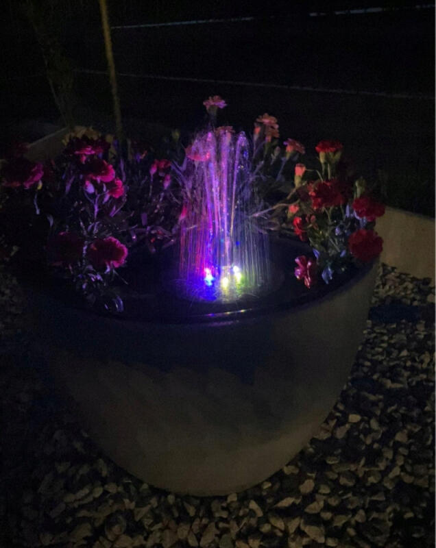 Fontanna posiada aż 6 diod, świecące w trybie RGB (6 kolorów). Oświetlenie działa po zmroku i świeci kolorami na przemian.