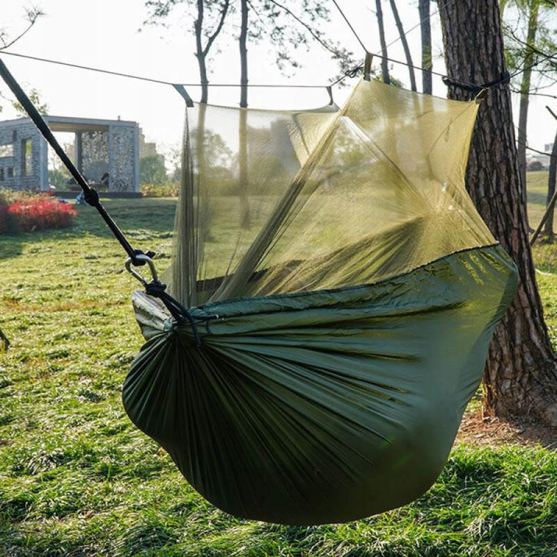Ten hamak na zewnątrz jest idealny dla tych, którzy kochają podróże. Jest wykonany z nylonu, dzięki czemu jest wyjątkowo lekki i oddychający, a jego rozłożenie zajmuje kilka minut. Jest idealny na kemping, wędrówki z plecakiem, wycieczki, podróże, ogólne eksploracje, a nawet świetnie nadaje się na własne podwórko. Z jego wnętrza będziesz cieszyć się wspaniałymi widokami na świeżym powietrzu.