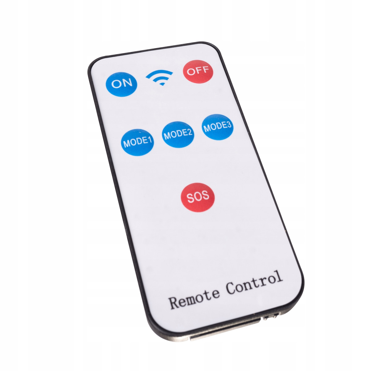 - PILOT + 4 TRYBY PRACY – wygodne sterowanie lampą odbywa się przy pomocy pilota. Posiada on przyciski Off i On oraz 3 tryby przełączania. ON- Włącz - OFF - Wyłącz MODE 1 - Tryb 1: Po wykryciu ruchu, lampa świeci 100% mocy maksymalnej przez 30 sekund. MODE 2 - Tryb 2: Po wykryciu ruchu, lampa świeci 30% mocy maksymalnej przez 30 sekund. MODE 3 - Tryb 3: Po wykryciu ruchu, lampa świeci 50% mocy maksymalnej przez 30 sekund. SOS - przycisk SOS wyłącza czujnik ruchu i czujnik zmierzchu , lampa świeci na stałe do rozładowania akumulatora na ok 50- 70% mocy.