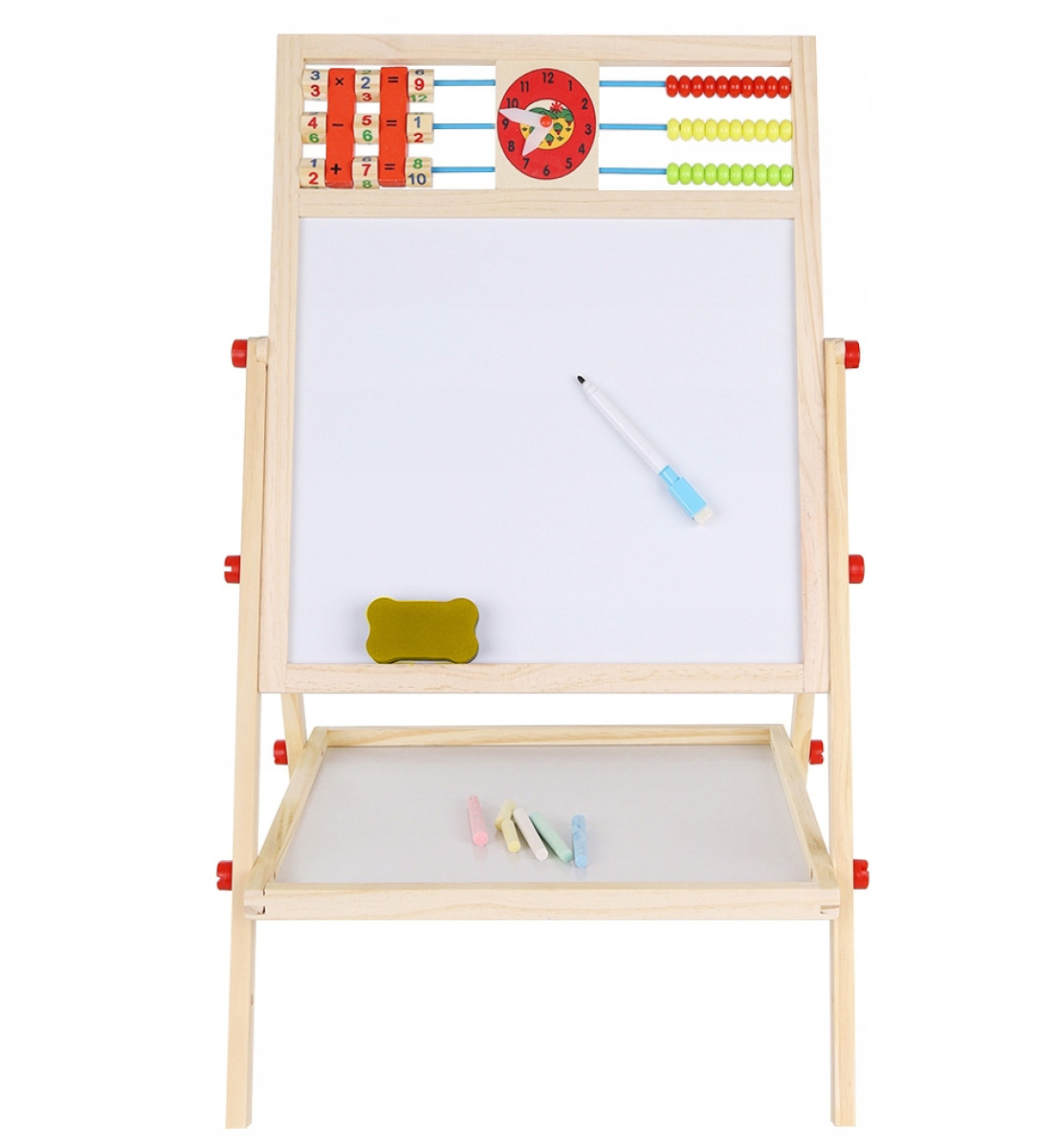 Rama wielofunkcyjnej tablicy edukacyjnej wykonana jest w całości z drewna – wszystko jest doskonale wyszlifowane i bezpieczne dla najmłodszych. Tablica posiada klasyczne liczydło z koralikami, z którym dziecko zacznie przygodę z liczeniem. Następnie może uczyć się podstawowych działań matematycznych, takich jak dodawanie, odejmowanie oraz mnożenie. Dziecko będzie miało również do czynienia z zegarem, na którym będzie mogło dowolnie ustawić czas za pomocą wskazówek; nauczy się rozpoznawania godziny.