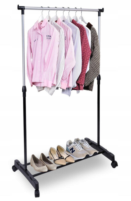 Praktyczny i wytrzymały wieszak garderobiany na kółkach z półką na buty. Dzięki pokrętłom możesz dostosować wysokość wieszaka do swoich potrzeb.