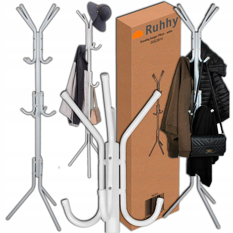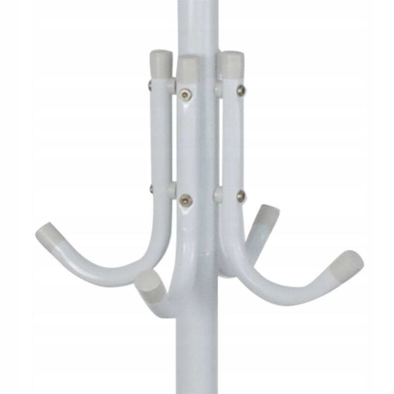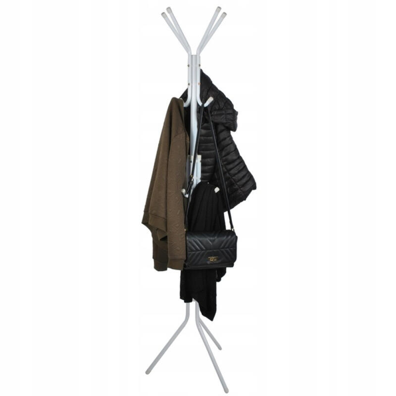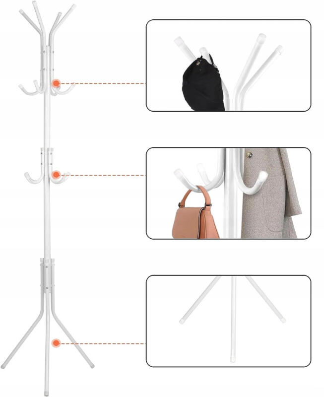 - DUŻA LICZBA HACZYKÓW Z OSŁONKAMI – aż 12 haczyków umożliwia zawieszenie dużej ilości odzieży, nakryć głowy czy też parasoli. Plastikowe osłony zabezpieczają przed uszkodzeniem odzieży oraz chronią powierzchnię, na której postawiony jest wieszak.
