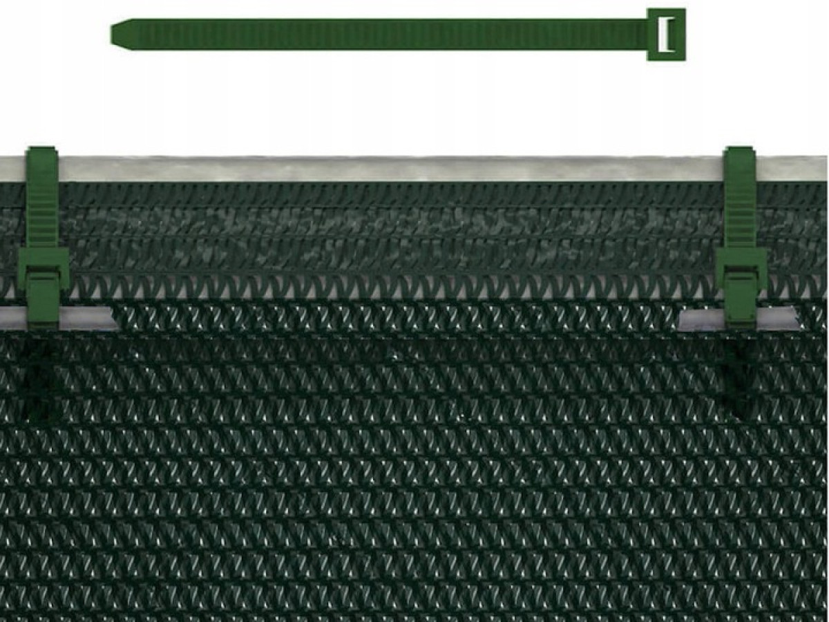 Proponujemy mocowanie siatki cieniującej za pomocą opasek zaciskowych (zielone). To najprostszy i najszybszy sposób montażu do niemal każdej powierzchni.