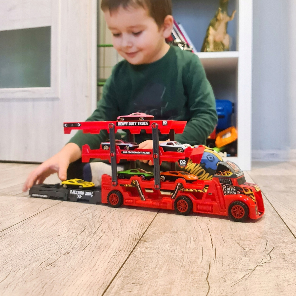 - 3 POZIOMOWA NACZEPA - laweta posiada 3 poziomy przeznaczone na bezpieczne przewożenie i przechowywanie samochodzików, dzięki temu pociecha nie zgubi ani jednego cennego autka oraz będzie mogła transportować je po torach wyścigowych na całym świecie.