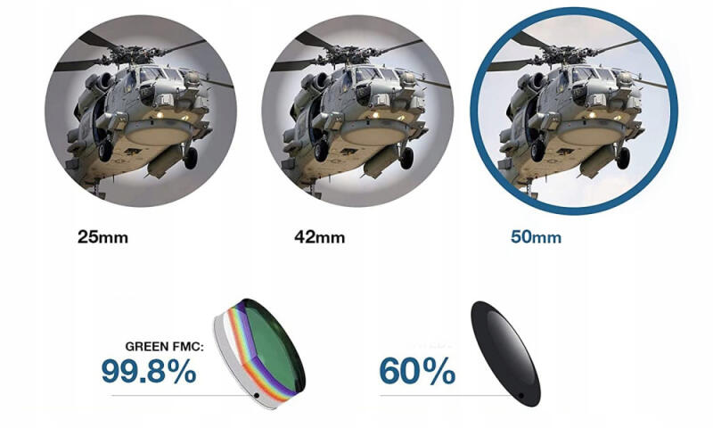 Cała powierzchnia optyki została pokryta wielowarstwową czarną powłoką antyrefleksyjną FMC, która zapobiega promieniowaniu UV, niweluje odblaski oraz zapewnia maksymalną transmisję światła.