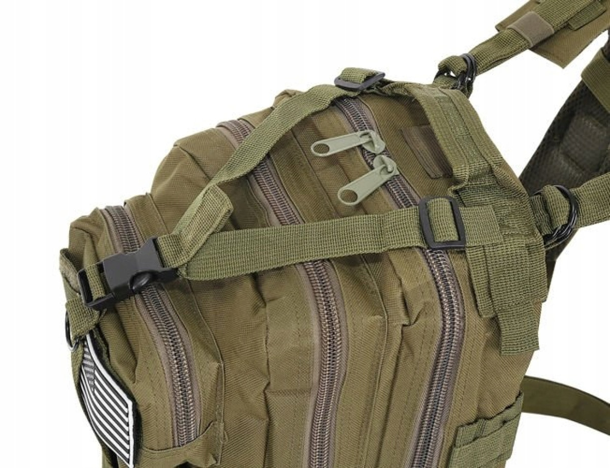 - SYSTEM SZYBKIEGO WYPINANIA PLECAKA - plecak posiada system nośny, który składa się z profilowanych szelek z szybkowyczepnymi klamrami, jest to praktyczne rozwiązanie i służy do natychmiastowego zrzucenia plecaka. Za stabilne przenoszenie odpowiada płynna regulacja profilowanych szelek, pas piersiowy oraz pas biodrowy, który może zostać odczepiony – pas pozwala odciążyć kręgosłup oraz barki podczas noszenia plecaka – cały ciężar zostaje skupiony na biodrach. Na froncie plecaka oraz na szelkach zastosowano taśmy PALS, które umożliwiają mocowanie oporządzenia w systemie MOLLE – pozwala to na montaż dodatkowych kieszeni.