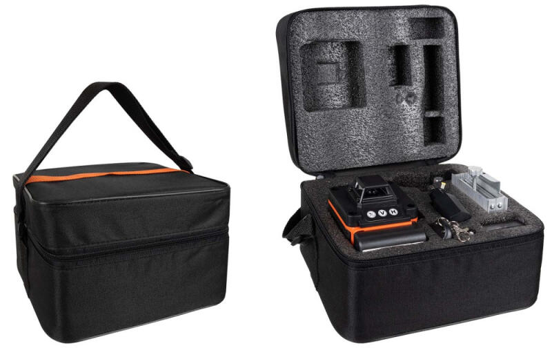 Komplet znajduje się w torbie z regulowanym paskiem. Posiada również piankową wytłoczkę, która zabezpiecza poziomicę i jej akcesoria w czasie transportowania czy przechowywania.