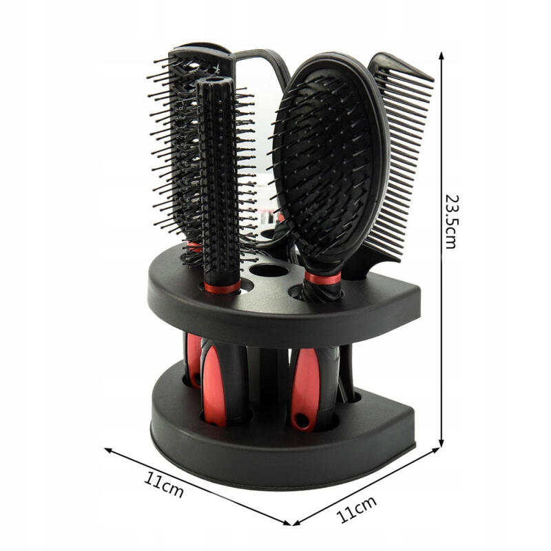 Szczotka do masażu wymasuje Ci głowę i poprawi ukrwienie, szczotka płaska pomoże w większości przypadków, szczotka do stylizacji pomoże Ci ułożyć wymarzoną fryzurę, grzebień rozczesze nawet najbardziej niesforne włosy, kompaktowe lusterko uratuje Ci skórę wszędzie po za domem, a kompaktowy stojak ułatwi przechowywanie szczotek.