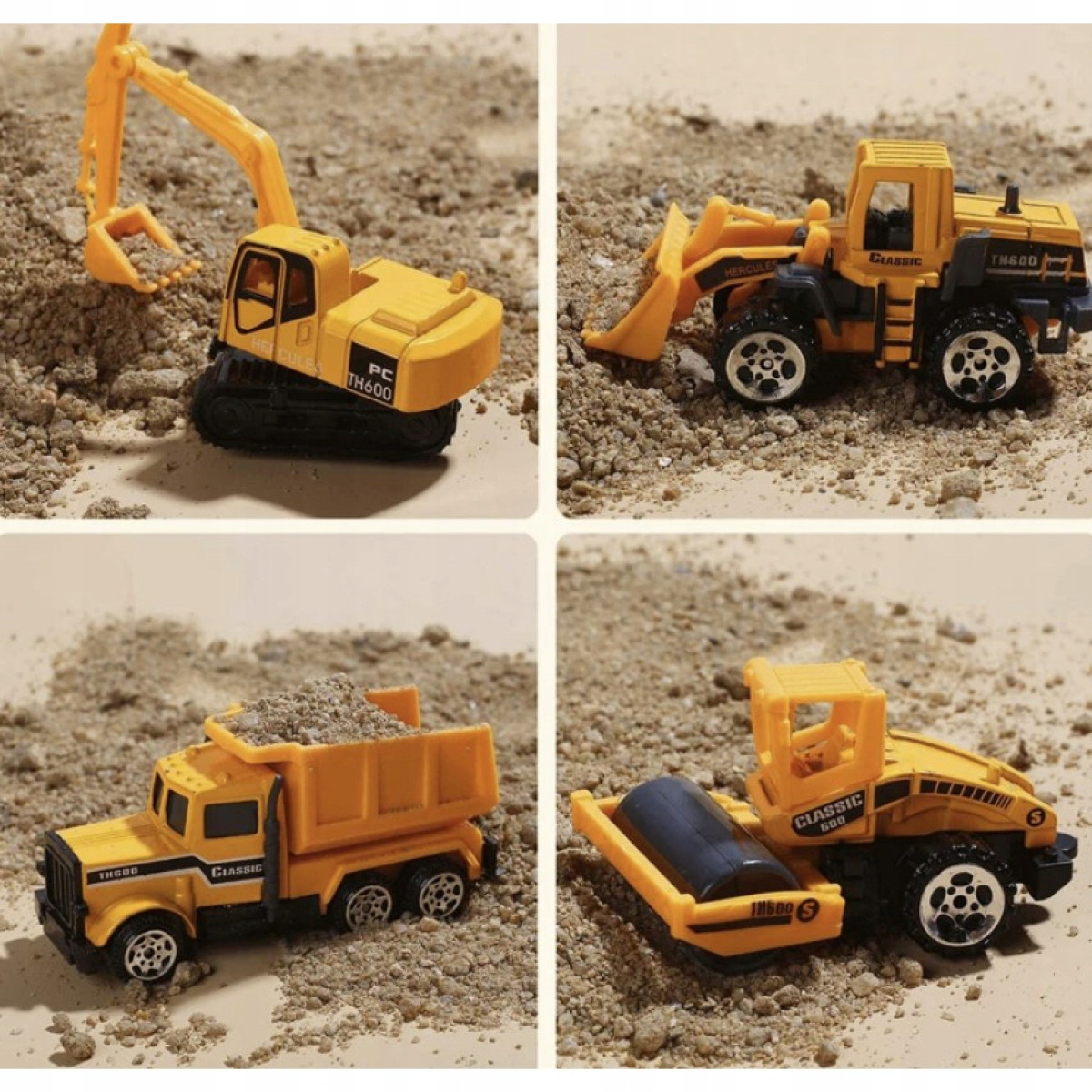 Laweta + 6 maszyn budowlanych, którymi dziecko może bawić się osobno.