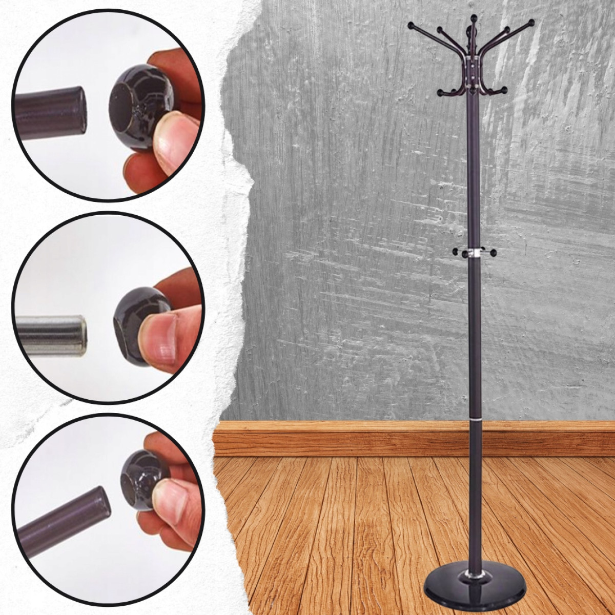 ➡️ DUŻA LICZBA HACZYKÓW Z PLASTIKOWYMI OSŁONAMI – aż 12 haczyków umożliwia zawieszenie dużej ilości odzieży, nakryć głowy czy też parasoli. Plastikowe osłony zabezpieczają przed uszkodzeniem odzieży oraz chronią powierzchnię, na której postawiony jest wieszak.