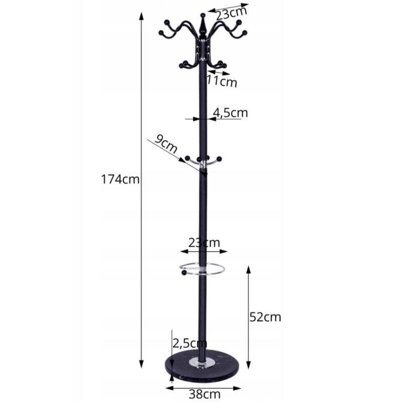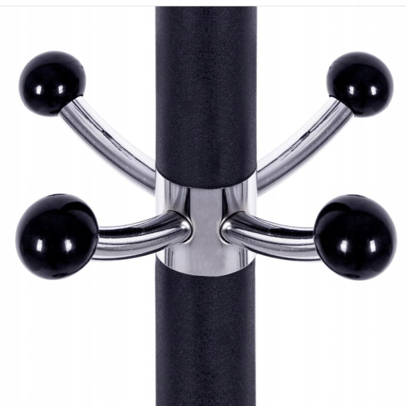 W górnej części znajdują się pięć ramion, które tworzą aż 8 miejsc do odwieszenia garderoby. W połowie wysokości znajdują się dodatkowe haczyki, odpowiednie na czapki, czy też torebki. Poniżej znajduje się specjalna spirala, która służy do odstawienia parasola.